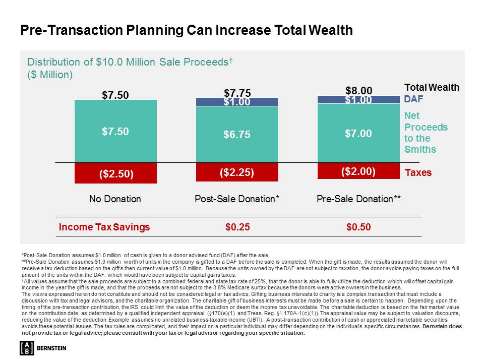 The views expressed herein do not constitute and should not be considered legal or tax advice. Gifting business interests to charity is a complex transaction that must include a discussion with tax and legal advisors, and the charitable organization. The charitable gift of business interests must be made before a sale is certain to happen. Depending upon the timing of the pre-transaction contribution, the IRS could limit the value of the deduction or deem the income tax unavoidable. The charitable deduction is based on the fair market value on the contribution date, as determined by a qualified independent appraisal (§170(e)(1) and Treas. Reg. §1.170A-1(c)(1)). The appraisal value may be subject to valuation discounts, reducing the value of the deduction. Example assumes no unrelated business taxable income (UBTI). A post-transaction contribution of cash or appreciated marketable securities avoids these potential issues. The tax rules are complicated, and their impact on a particular individual may differ depending on the individual’s specific circumstances. Bernstein does not provide tax or legal advice; please consult with your legal or tax advisor regarding your specific situation.
